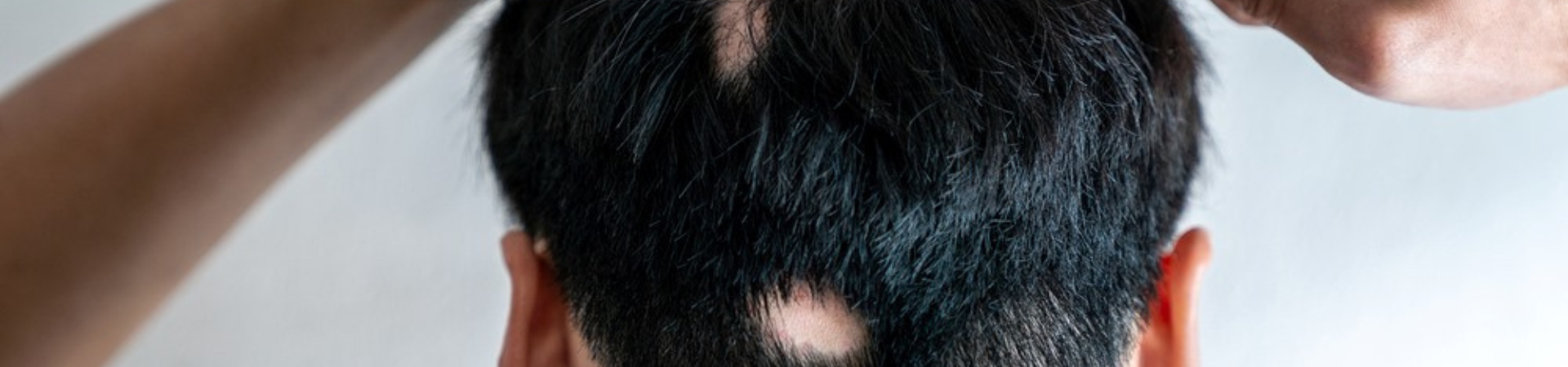 - Σταδιακή απώλεια μαλλιών: αρχίζει η εμφάνιση γυμνών «μπαλωμάτων» συνήθως στο τριχωτό κεφαλής, αλλά μπορεί να εμφανιστεί στις βλεφαρίδες, τα φρύδια ή τη γενειάδα του ανδρός.