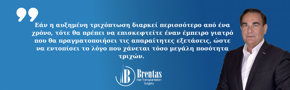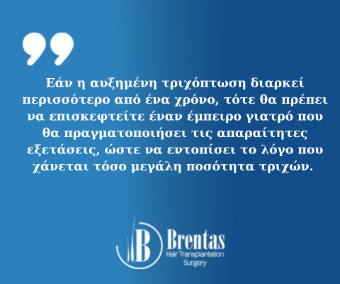 Εάν η αυξημένη τριχόπτωση διαρκεί περισσότερο από ένα χρόνο, τότε θα πρέπει να επισκεφτείτε έναν έμπειρο γιατρό που θα πραγματοποιήσει τις απαραίτητες εξετάσεις, ώστε να εντοπίσει το λόγο που χάνεται τόσο μεγάλη ποσότητα τριχών. Με βάση τη διάγνωση, θα δημιουργήσει και το κατάλληλο πλάνο θεραπείας που μπορείτε να ακολουθήσετε.