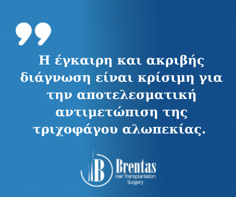 Η έγκαιρη και ακριβής διάγνωση είναι κρίσιμη για την αποτελεσματική αντιμετώπιση της τριχοφάγου αλωπεκίας. Κατά την επίσκεψη στον γιατρό καταγράφεται το αναλυτικό ιατρικό ιστορικό του ασθενή, ώστε να εντοπιστούν τα αίτια. Επίσης, πραγματοποιείται εξέταση του ασθενή, συνήθως με τη μέθοδο τριχοσκόπησης. Η τριχοσκόπηση πραγματοποιείται με ειδική δερματοσκοπική συσκευή που παρέχει μεγεθυμένη εικόνα του τριχωτού και των τριχών. Τέλος, ενδέχεται να πραγματοποιηθούν αιματολογικές εξετάσεις για τη διερεύνηση των αυτοάνοσων δεικτών.